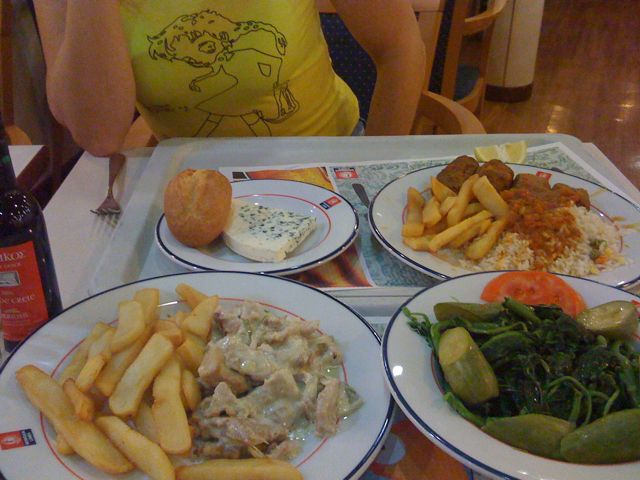 In the mean time we’ve started of on a reasonably good foot by feeding ourselves in the restaurant of the ferry: veal, tsoutsoukakia, horta, and blue cheese, washed down with some dry red wine. Could be worse. We’re heading for the bar for a sleeping cap and then hit the sack.
